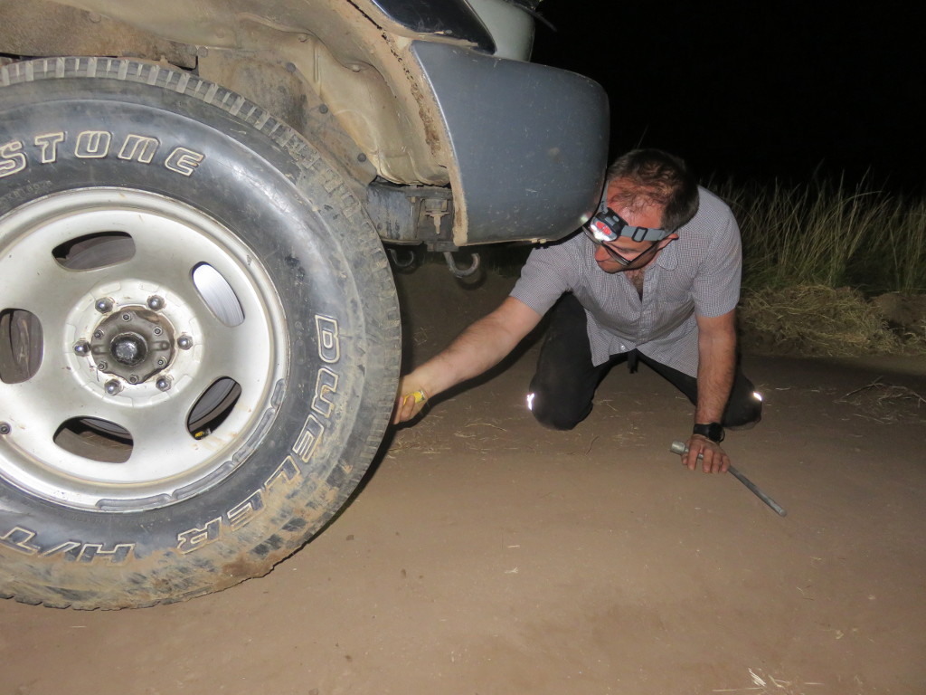 Fortunately for us, Bubbles handled the situation like a champion and we pushed through the bush and found an actual road. Ten minutes later, we were rewarded with some juvenile lions playing on the side of the road. It seems we had entered South Luangwa National Park through little used “road” and now had 70km of night time game driving to arrive to our campsite. We soon saw plenty of game as the “road” through the park was mostly passable. Just when we thought the worst was over, Bubbles sprang a leak in the front driver side tire. Tired and ready for bed, I suggested we camp on the road. Unlike me, Ross was not scared of the dark or animals and soon we were out of the car changing the tire.