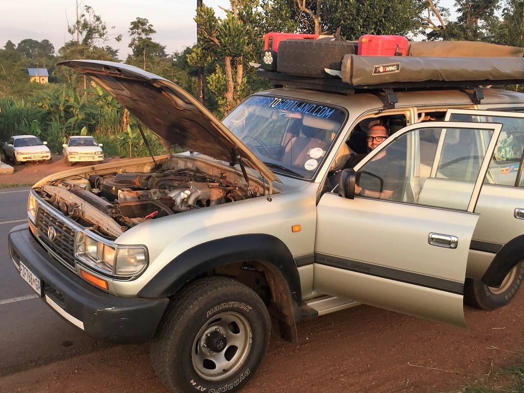 Unfortunately Bubbles suffered a second snapped fan belt which necessitated some roadside repairs. The delay from our detour combined with the repair time meant we weren’t going to make it all the way to Murchison. We decided to stop off at the Uganda rhino sanctuary, roughly half way there, and look for a camping spot. Unfortunately we arrived after the gates were closed and opted to bush camp rather than pay $20 to summon a game ranger to escort us through the reserve. We drove around campsite hunting with the aid of our ridiculously bright spotlights (a.k.a. “The Apocalypse”*) till we found the perfect spot just off the road. Well, we thought it was the perfect spot until a few gentlemen from the Ugandan Anti-Terrorism Police arrived and kindly asked us to move. Apparently, we had scared some of the locals with our spotlights who had subsequently reported us to the authorities.